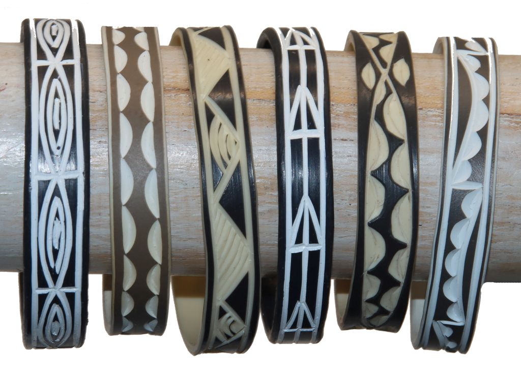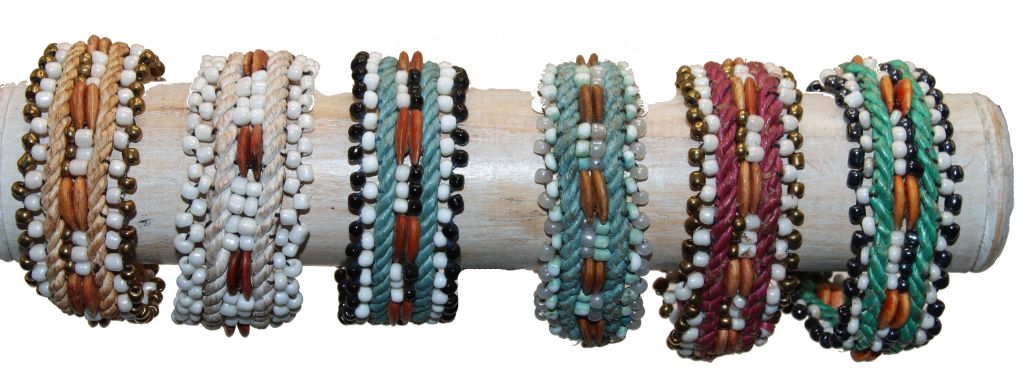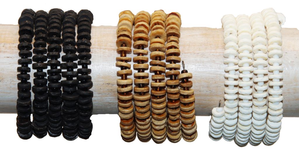Neuer Schmuck aus Namibia: von den Frauen der Gruppe Himba (im Norden Namibias) handgefertigte Armbänder mit Glasperlen, Sisal und speziell getrockneten Kernen. Auch PVC Rohre die recycelt werden, eignen sich toll für die Herstellung fantasievoller Armreifen. Dann nicht zuletzt die edlen Spiralarmreifen aus Straußeneischalen.
